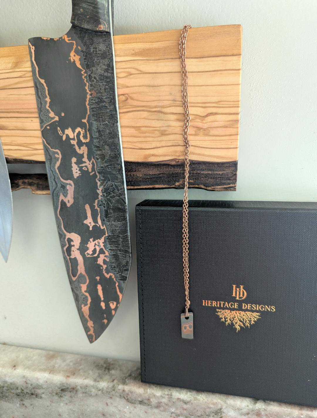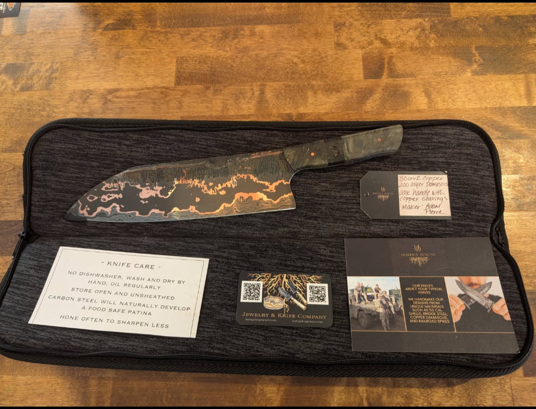 Chef knife made with a Damascus core with four layers of copper and four layers of 80crv2. Maple Burl and dyed resin copper handle.